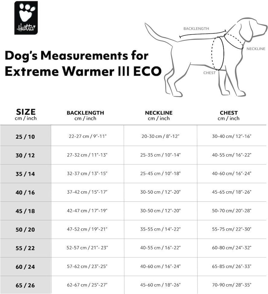 I have an older version of this coat, and it is outstanding. The sizing runs big and even though I measured properly and ordered the recommended size, the coat is big on the dog for which I was ordering it. I used it for a year and then decided to keep it for my larger dog, who is growing older and may soon feel cold more. I ordered this Extreme Warmer III ECO one size smaller. It arrived today and is perfect for my dog. It’s even got some great updates. I like that it snaps under her tail, although I’m not sure whether she’ll be able to pee without interference. That first glance, I’m not crazy about the new hook attachment for the belly band, but I’m sure I’ll get used to it. Hurtta coats are the best, hands-down. They keep my dogs warm, and they stay on and have great adjustment points. They’re worth the expense.