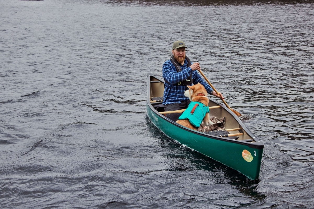 After getting him to explore the jacket with treats, he now puts it on eagerly and is able to sit, lie down, and run around. The only thing left is to find out what he thinks about the water, the canoe and camping :o)