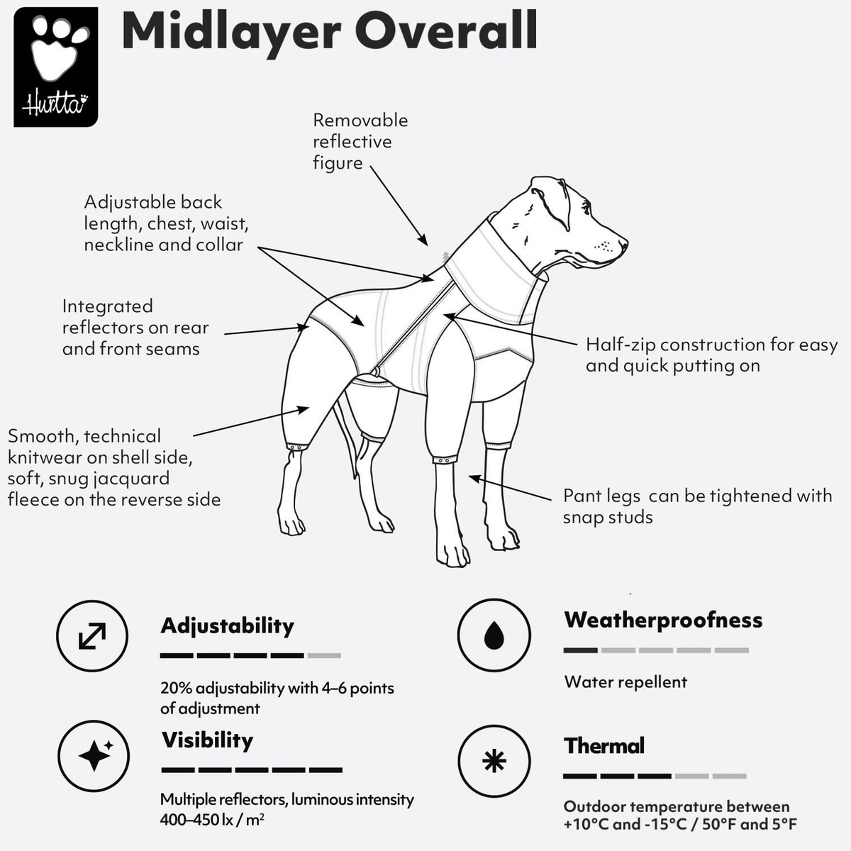 Hurtta products are among the best in winter wear. With the zippers, drawstrings, and snaps, this suit is easy to put on, even simpler to remove, and adjustable so nothings gaping or slipping down. I have this mid layer, the thinner suit, and the extreme overall with the eco mudventure rain suit on the way. My dog has short single layer fur and I keep my house cold in the winter to save on heating so he wears the thinner suit around the house and in 45° weather. The mid layer is light enough to wear around the house and should be comfortable down to 30's or maybe even lower if he's active. Once it gets to the teens or if he's lower activity, I layer another coat on top.