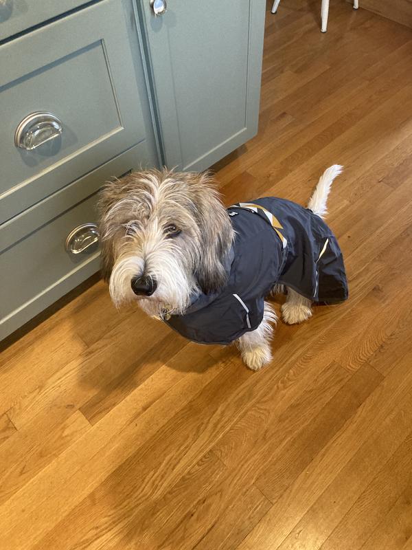 My dog is a petit basset griffon vendeen (PBGV). I have never found clothing for him that covered his long body without being ridiculously loose around the neck & chest. Until Hurtta! The Mudventure Eco Raincoat size 18 fits perfectly with an adjustable belt that has room to grow if his chest gets any bigger. And it kept him dry in yesterday’s rain storm!