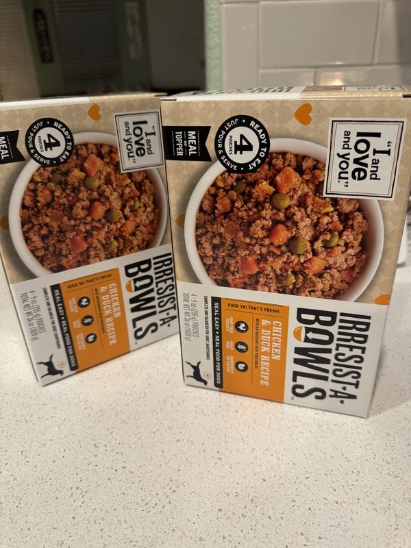 - DealI and Love and You Irresist-a-Bowls Grain-Free Chicken & Beef Recipe Dog Food, 9-oz pouch, 8 count$19.96 Chewy Price$34.99 List Price$18.96 Autoship PricePromo, Spend $100, Get $30 eGift Card with code NEWYEAR +1 deal