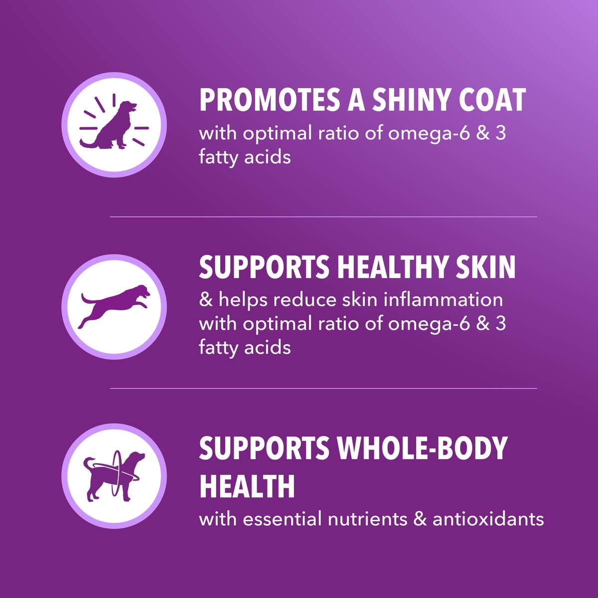 - This food contains the optimal omega 4.5:3 fatty acid ratio to support skin and coat health.