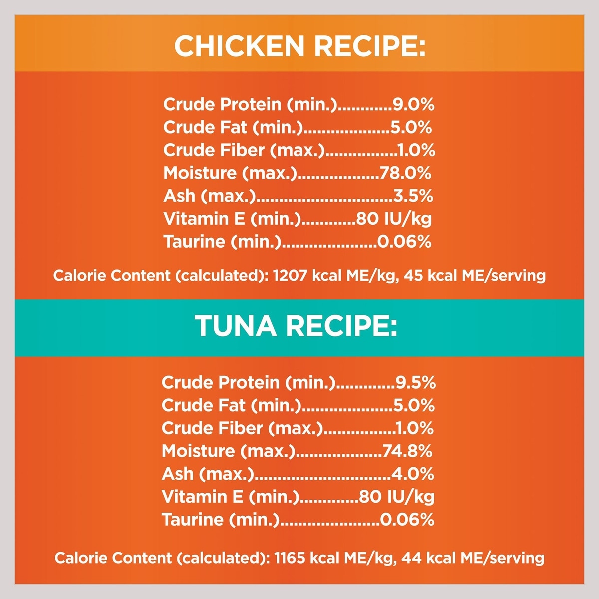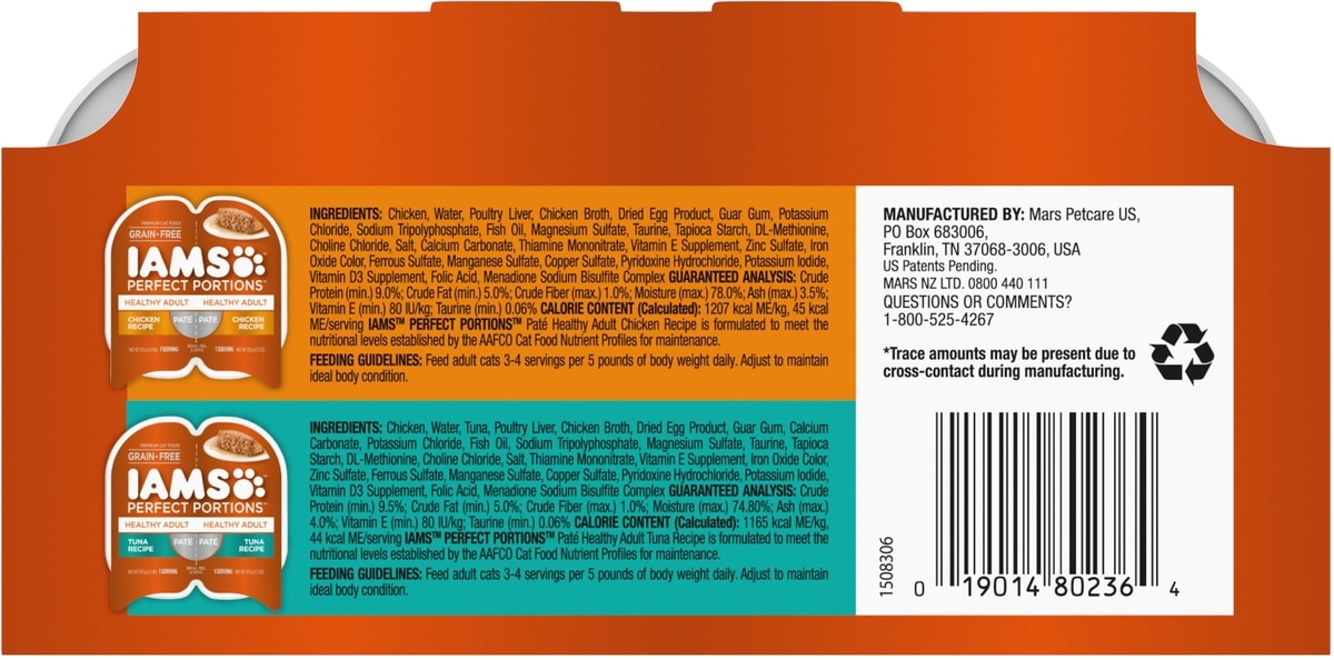 IAMS Perfect Portions Healthy Adult Variety Pack Chicken or Tuna Recipe Paté supports your cat’s health and well-being. This multipack of easy-peel twin-pack meals contains chicken recipe and tuna recipe. Soft and moist, these tasty recipes provide complete and balanced nutrition for adult cats.