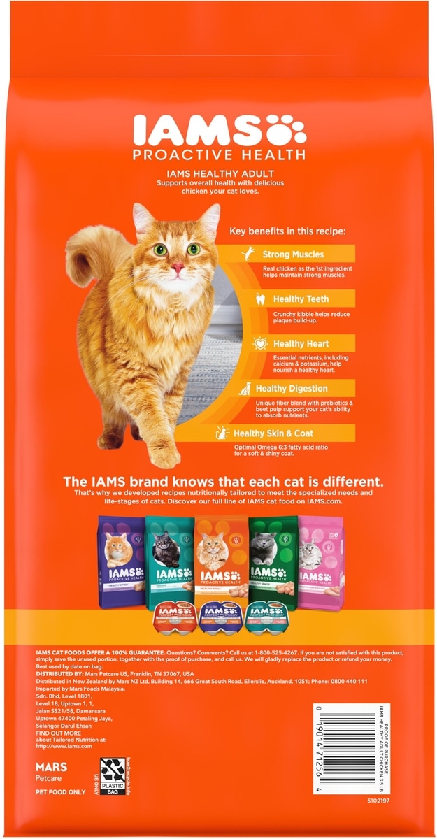 Support vibrant, whole-body health with IAMS Proactive Health Healthy Adult Dry Cat Food. This wholesome, tasty recipe has essential nutrients like potassium and calcium to help nourish a healthy heart. Omega-3 and 6 fatty acids help nourish skin and promote a glossy, vibrant coat, too.
