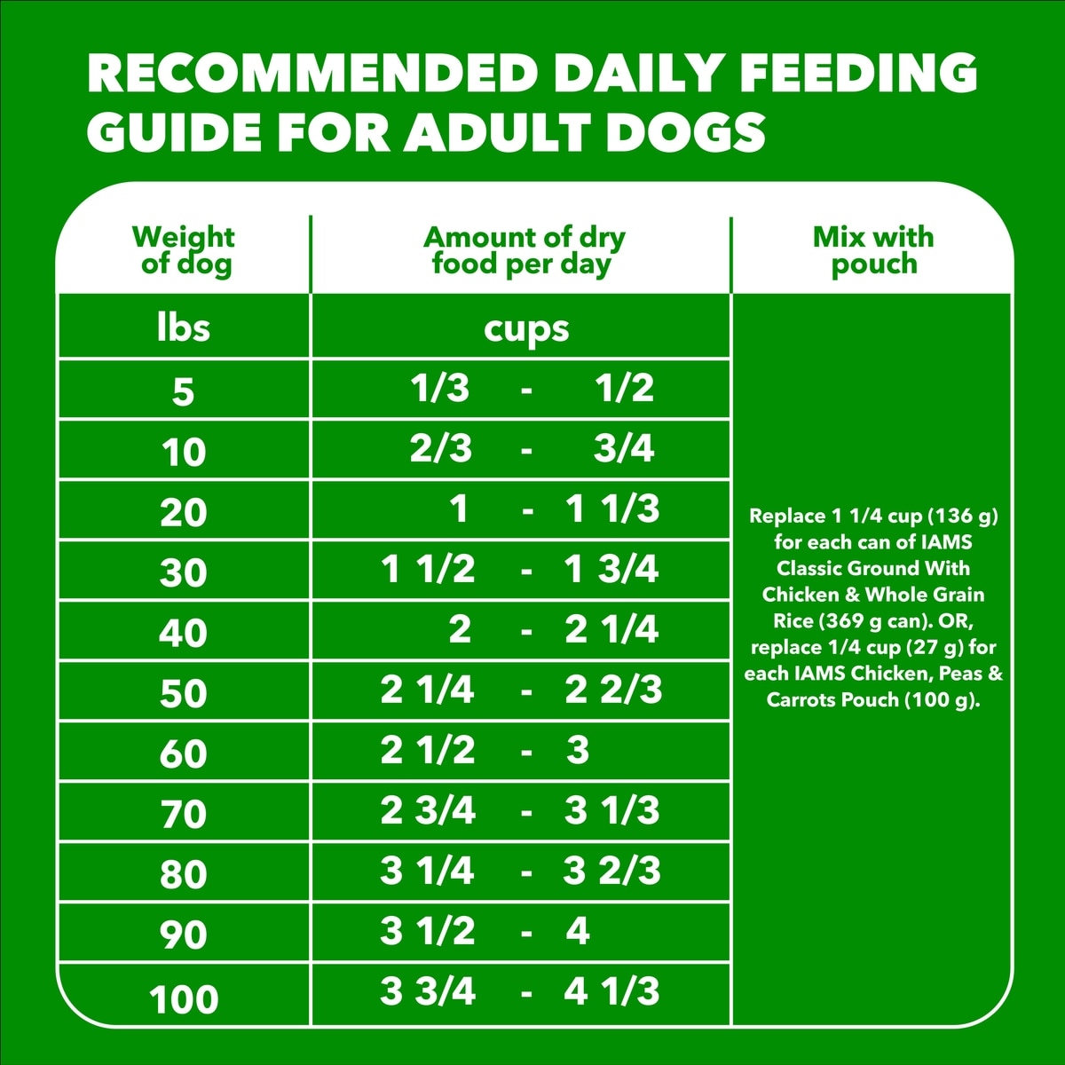 Replace 1 1/4 cup (136 g) for each can of IAMS Classic Ground With Chicken & Whole Grain Rice (369 g can). Or, replace 1/4 cup (27 g) for each pouch of IAMS Chicken, Peas & Carrots Recipe (100 g pouch).