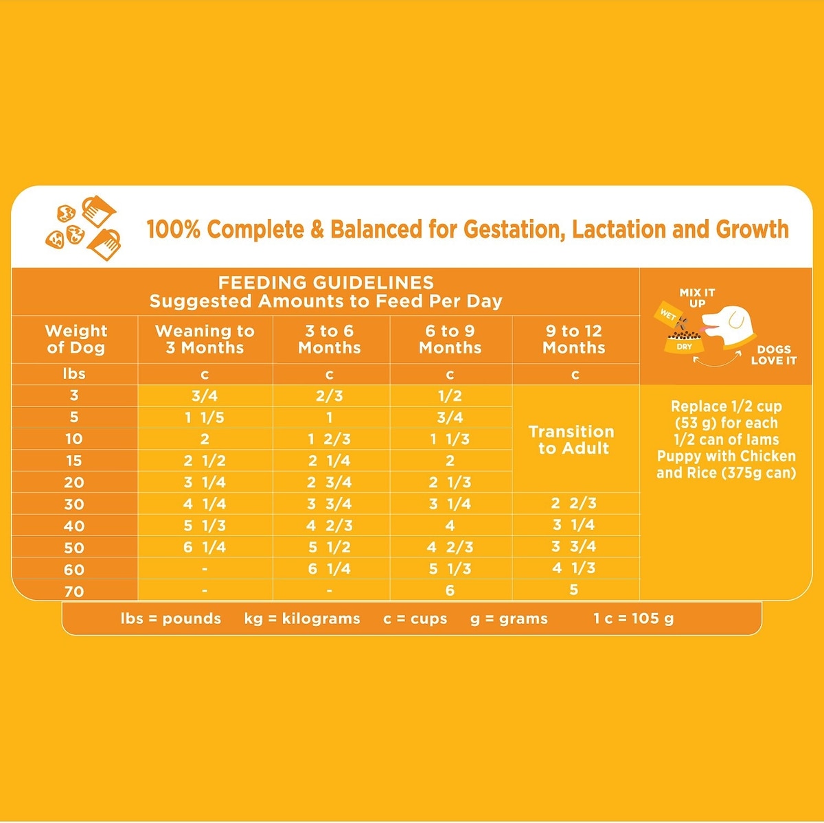 IAMS Puppy food was created to meet the nutritional needs of puppies as they grow up, while IAMS Adult dog food supplies the nutrition your best friend needs through adulthood. IAMS senior formula supports healthy aging in your mature dog.