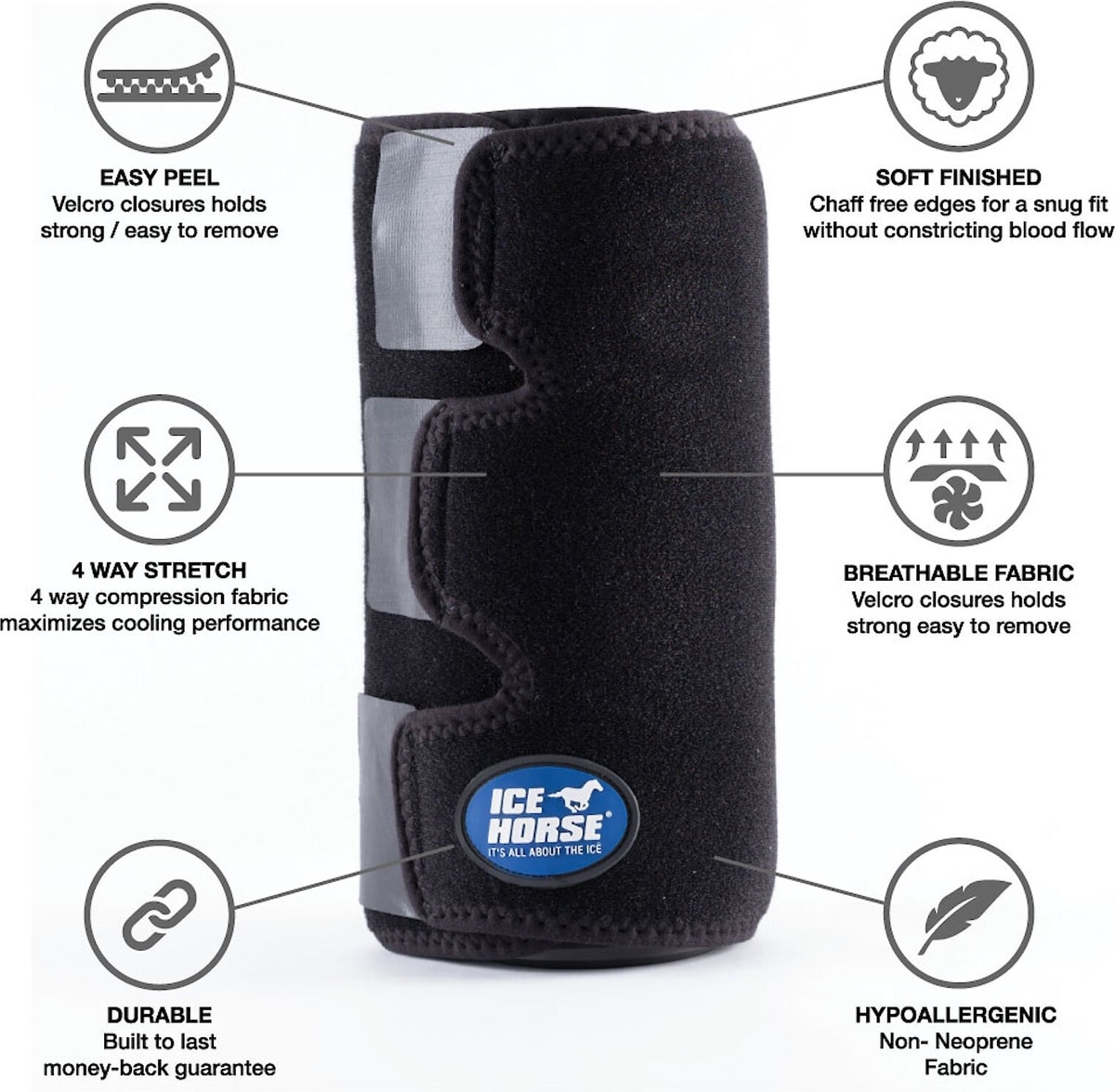 - Technical fabric wrap keeps cold inserts compressed and in place for therapeutic cooling of your pony or young horse’s tendons and splints.