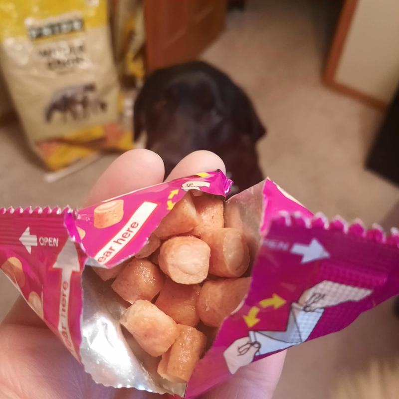 The only reason for less than 5 stars is the individual packages.The dog that could eat this treat (one is allergic to chicken) absolutely loved it. The treat we received was rated for small dogs and I have a chonky big boy, so for us the packaging served no problem as he ate them in one sitting. If you have smaller dogs however, the packaging could pose a problem as there really is no way to save them in the original individual package for later use. The treats are VERY moist and there were plenty in each little bag but they are rich and for a smaller dog maybe shouldn't be consumed all at once -- so just make sure you have a small ziploc type baggie ready to save them in. Since they are moist, there is a smell and if you touch them a lot, can get on fingers. But overall my dog loved them, I just will make sure to give him this treat at home in case of mess or if he doesn't eat them all in one sitting.