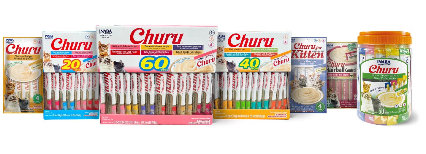- DealInaba Churu Grain-Free Tuna Puree Lickable Cat Treat, 0.5-oz tube, pack of 24$14.21 Chewy Price$26.94 List Price$13.50 Autoship PricePromo, Spend $100, Get $30 eGift Card with code NEWYEAR +1 deal