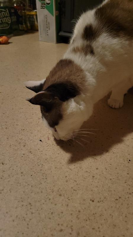 My senior went nuts over this treat. I must admit though, so did my younger cats. It’s easy to serve up with just a quick snip of the scissors. She lapped it up