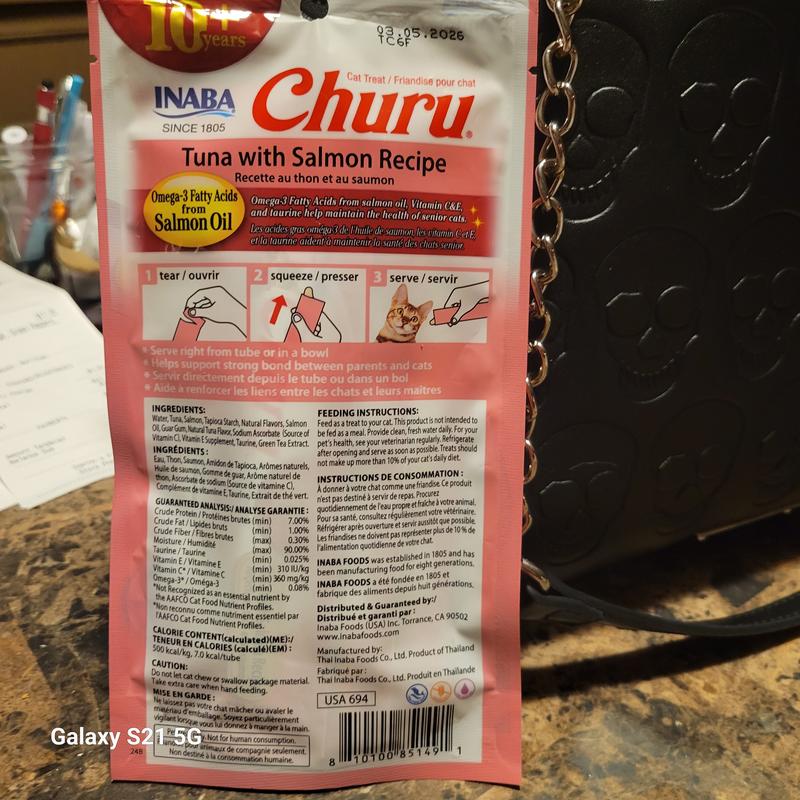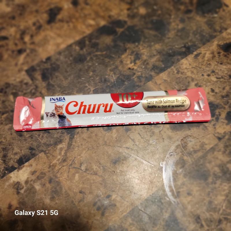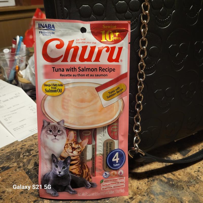 Our senior cats go crazy on the Inaba Churu lickable treats! They love the tuna with salmon recipe! As you can see in the photos, all our senior cats (aged 12-14) loved it. Looking at the ingredients of this lickable treat, it is indeed very healthy with no artificial flavors. And the top ingredients being Tuna and Salmon. We also love the fact that taurine, Vitamin C and E are added together with green tea extract (antioxidant) to provide a small boost to their senior health. The tube is also easy to peel and squeeze and they can't have enough of it. Great for providing bond between you and your senior cats at home. Highly recommended!
