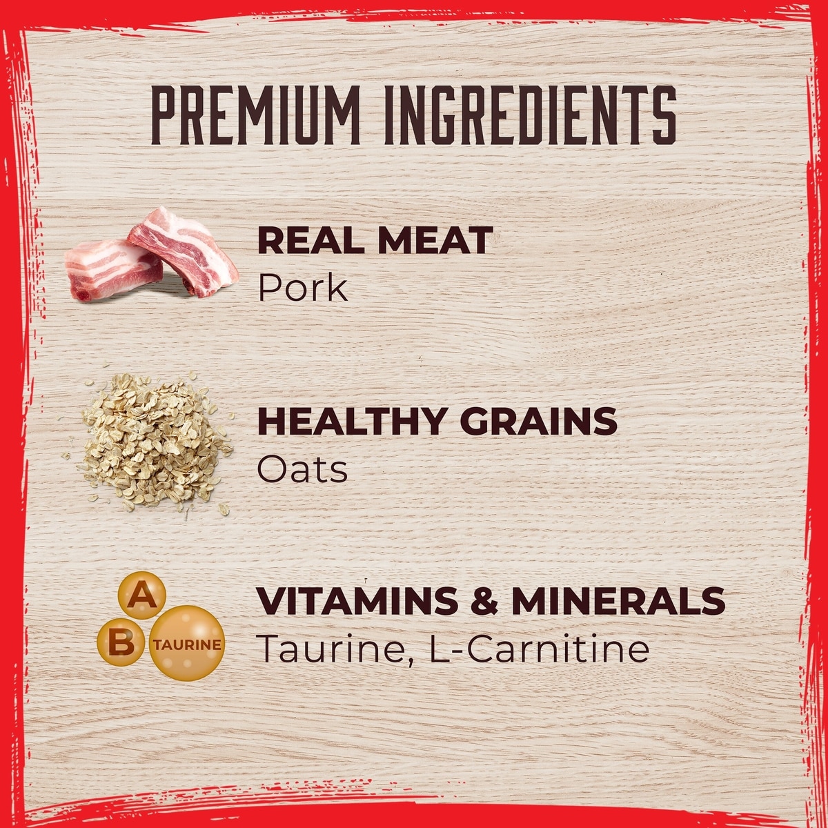 Pork, Pork Broth, Oats, Natural Pork Flavor, Tricalcium Phosphate, Calcium Carbonate, Agar-Agar, Vitamins (Vitamin A Supplement, Vitamin D3 Supplement, Vitamin E Supplement, Niacin Supplement, D-Calcium Pantothenate, Thiamine Mononitrate, Pyridoxine Hydrochloride, Riboflavin Supplement, Folic Acid, Vitamin B12 Supplement), Potassium Chloride, Choline Chloride, Minerals (Zinc Proteinate, Iron Proteinate, Copper Proteinate, Manganese Proteinate, Sodium Selenite, Calcium Iodate), Salt, Taurine.
