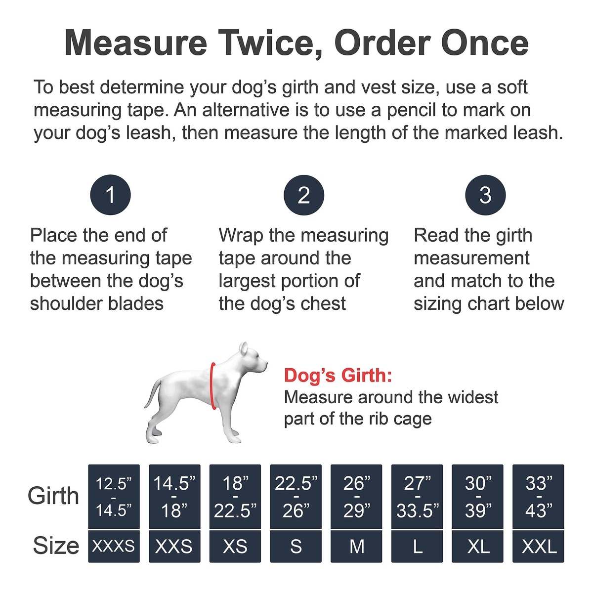 For the best fit, measure your dog's chest girth with a soft measuring tape. To measure, place the end of the measuring tape between your dog's shoulder blades and wrap it around the largest portion of their chest. For a complete sizing chart, click on the 'Size' tab, just under the product photos.