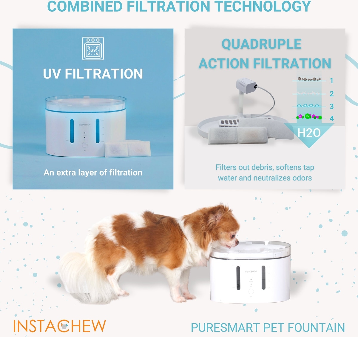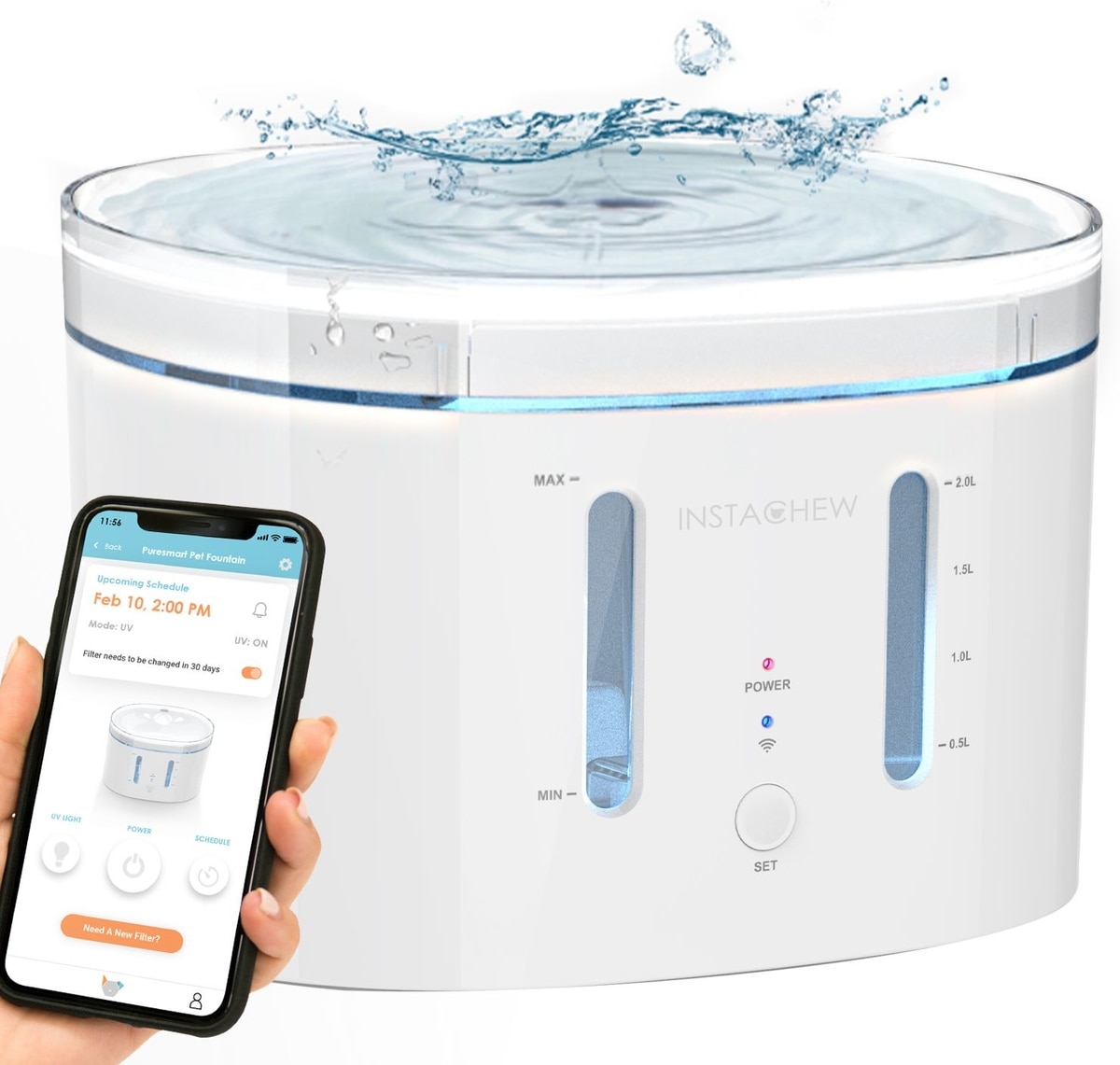 INSTACHEW Puresmart Water Fountain App Enabled Drinking Smart Automatic Pet Fountain for Dogs & Cats, White, 84-oz