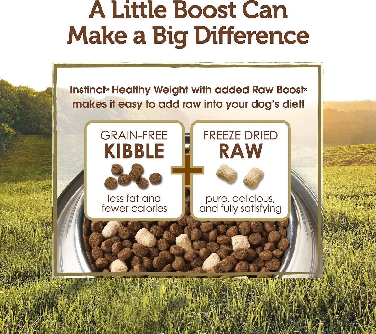 • Boosted nutrition for healthy weight with high-protein kibble + freeze-dried—for 25% less fat and 15% fewer calories than Instinct Raw Boost.