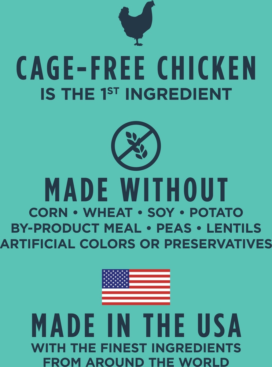 These recipes are made without corn, wheat, soy, potato, peas, lentils, by-product meal or artificial colors or preservatives.