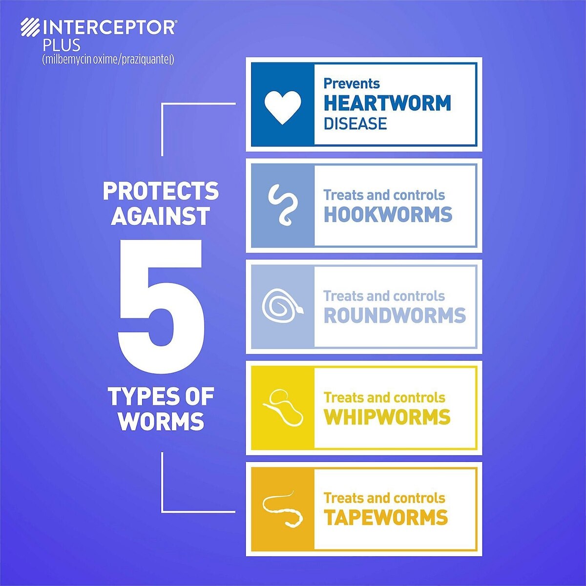 Interceptor Plus is a monthly, broad-spectrum parasiticide prescribed by your vet to help prevent heartworm disease. Plus, it treats and controls adult roundworm, adult hookworm, adult whipworm and adult tapeworm. It comes in a tasty chew, making dosing easy for you and your pet.