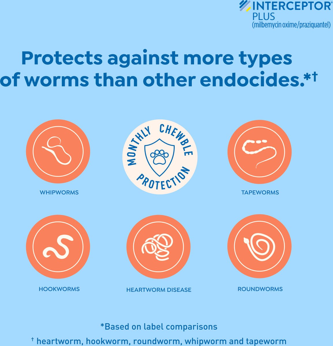 Interceptor Plus was made to protect canine companions from five common parasitic health threats. Just one dose every month prevents heartworm disease and controls hookworms, roundworms, whipworms, and tapeworms in dogs. Dosing is easy with the chicken-flavored chews, and protection can be achieved year-round with monthly use. Give your dog Interceptor Plus to protect your best friend from these dangerous parasites. Interceptor is a trademark of Elanco or its affiliates. PM-US-20-1050