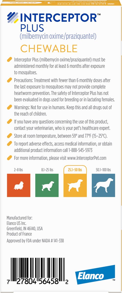 Interceptor Plus comes as a tasty, chicken-flavored chew, accepted by 96.6% of dogs in a field study, so you won’t have to battle to get your pup to take his medicine. Dogs love it and pet parents appreciate the ease.Simply give Interceptor Plus to your dog by hand or by adding it to a small amount of dog food, and make sure your dog chews up and swallows the complete dose.