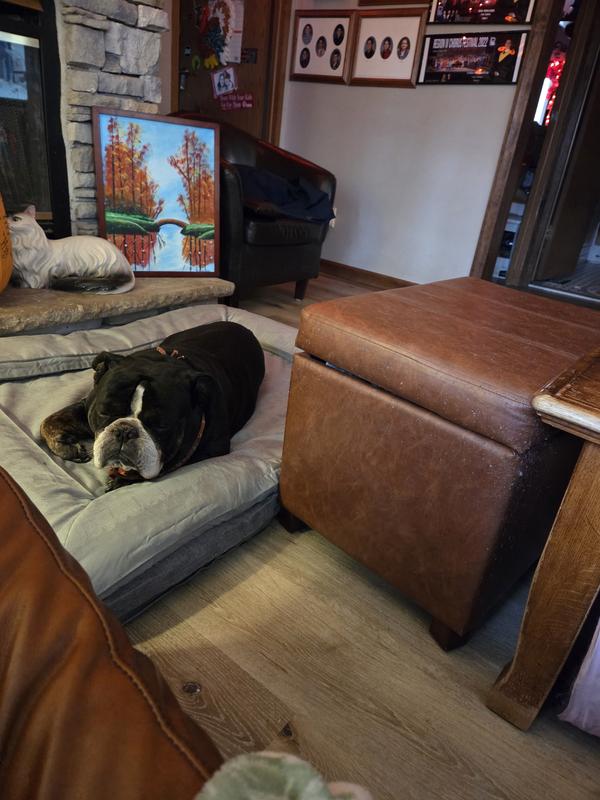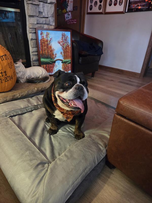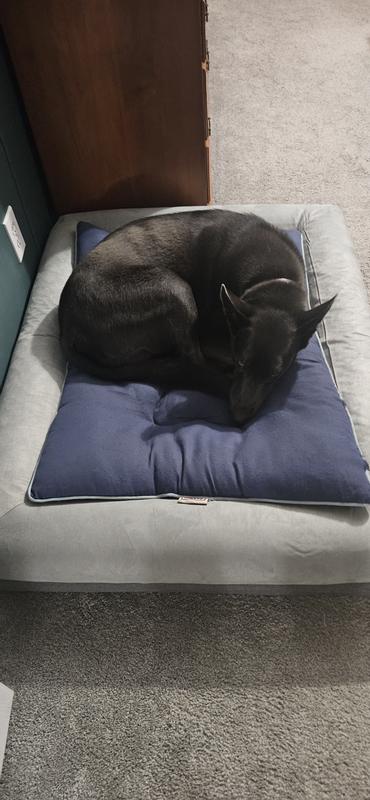 This bed is very stylish with a cover that looks like brushed suede. It is very cushioned so it’s perfect for pets like mine with arthritis. The cover has a zipper so it can be washed but what’s unique is that the inside foam is covered in waterproof plastic so you can clean the inside plastic cover while the foam stays clean and dry. It’s very stylish looking and I like the bumpers surrounding the bed, makes a nice nest to keep your pet comfy. Rec this!