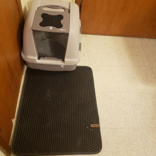 - This mat is made from two layers that work together to trap litter stuck to your cat’s paws or thrown out of the box.