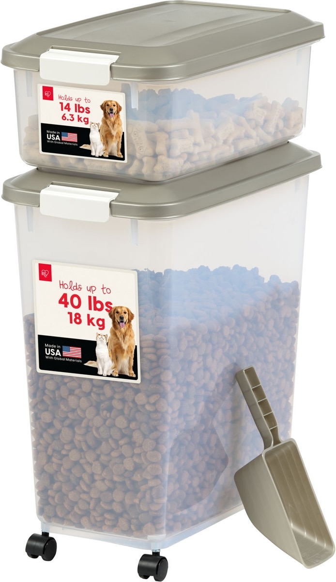 - IRIS WeatherPro Airtight Attachable Wheels & Scoop Dog, Cat & Bird Food Storage Container, Gray, 40-lbs$30.99 Chewy PricePromo, New Customers Only: Spend $49+, Get $20 eGift Card