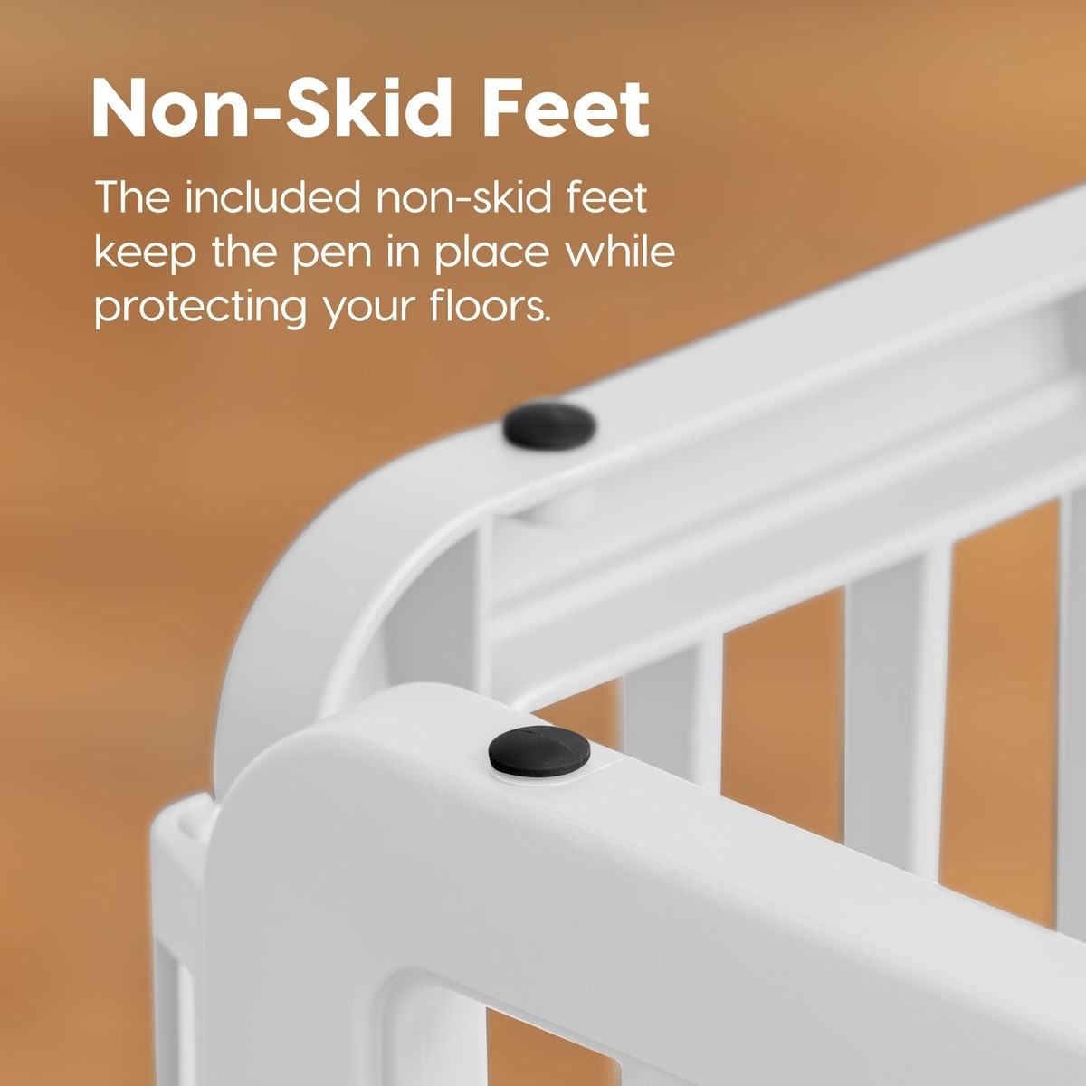 Each panel includes a non-skid rubber foot to prevent the playpen from moving around.