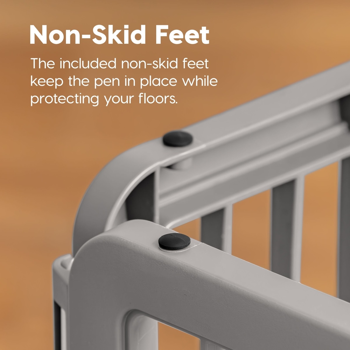 Each panel includes a non-skid rubber foot to prevent the playpen from moving around.