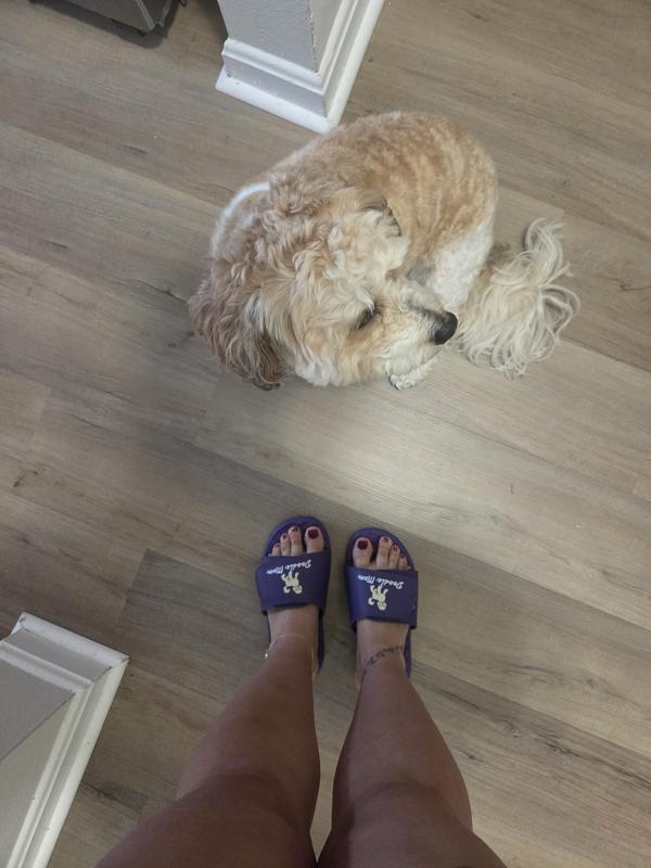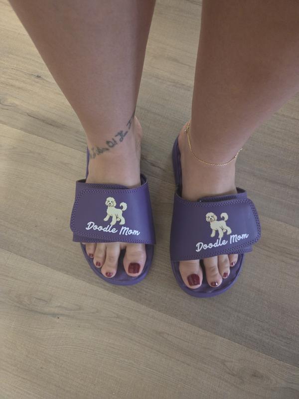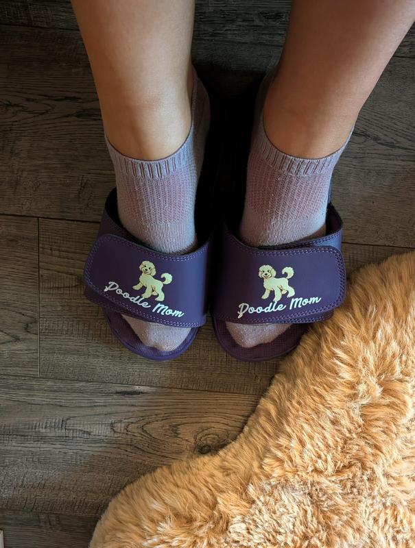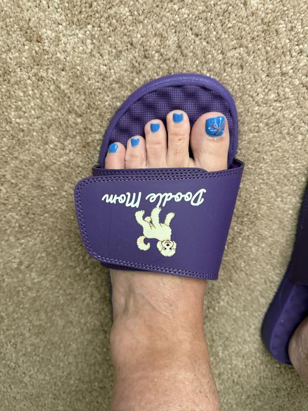 These were too cute to pass up! I have so manh "doodle moms" in my life. The slides were lightweight, but good quality. I love the dark blue color and they make perfect slip on shoes for those night time puppy potty breaks! They were also true to size with an adjustable top.
