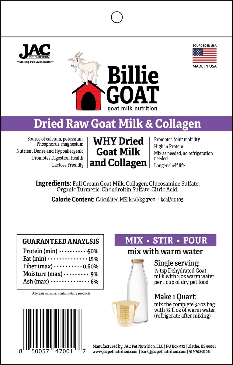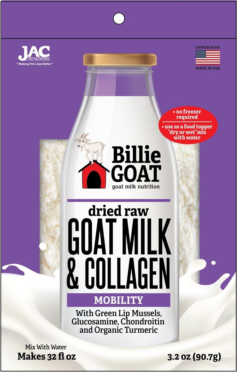JAC Pet Nutrition Adult Goat Milk & Collagen with Green Lip Mussels, Glucosimine, Chondroitin, Turmeric for Mobility Hip & Joint-Support Powdered Dog Food Topper, 3.2-oz bag
