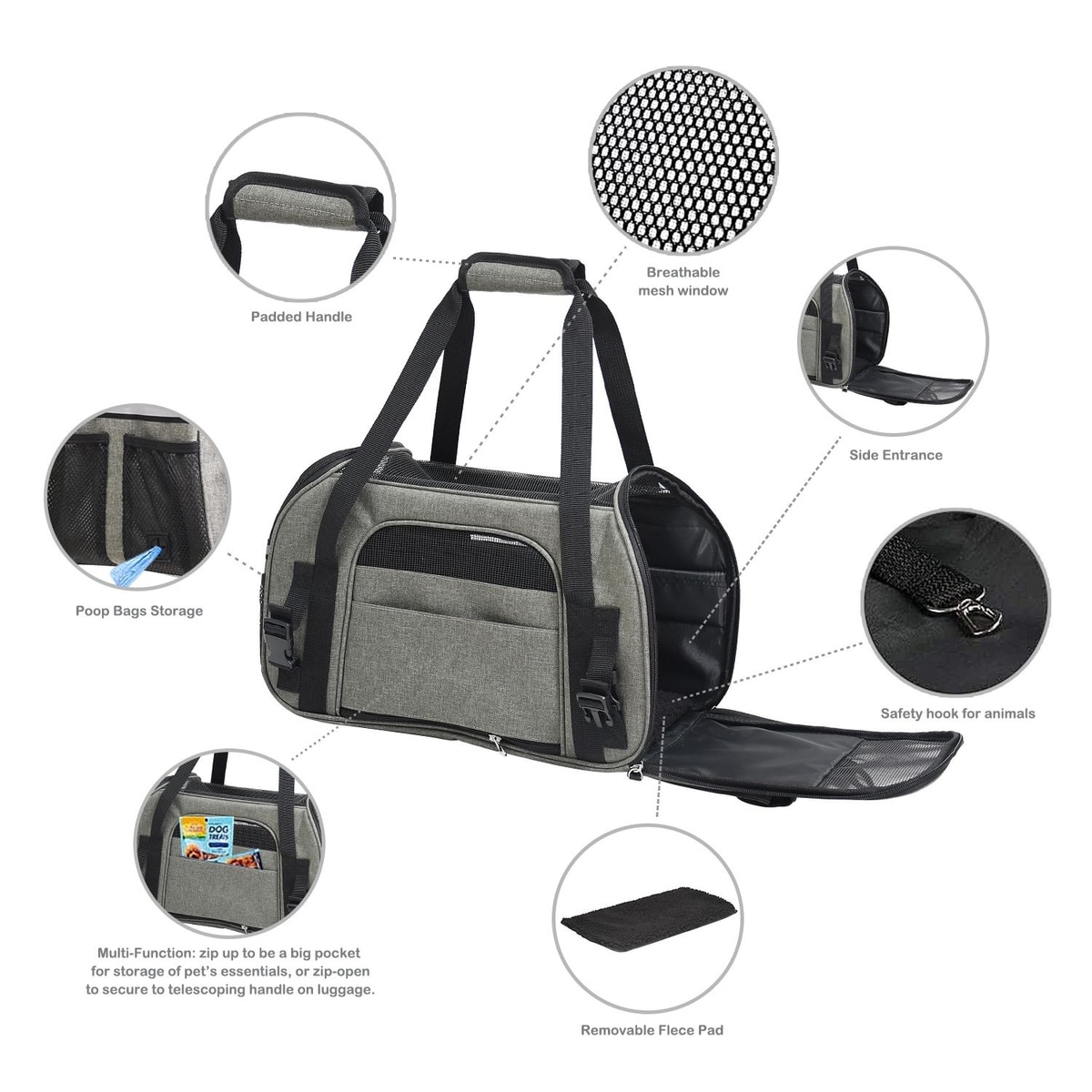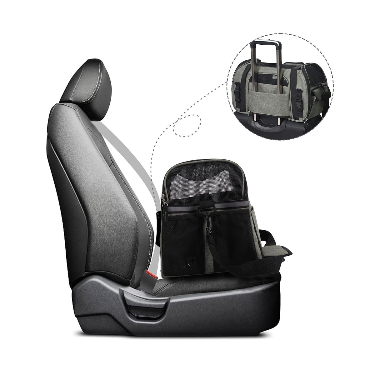 Airline-Approved Pet Carrier This soft-sided carrier includes mesh on the front and top and easy attachment to a vehicle seat belt for car travel. Anti-escape zippers and an adjustable padded shoulder strap, plus a pocket for storage space, make this a versatile choice for any trip.