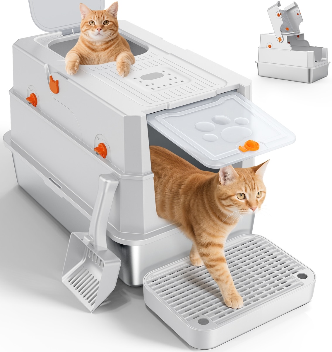 Great litter box! The stainless steel bottom is a game changer. We've never had a box that cleans up so easily. We also appreciate that the top is detachable, as