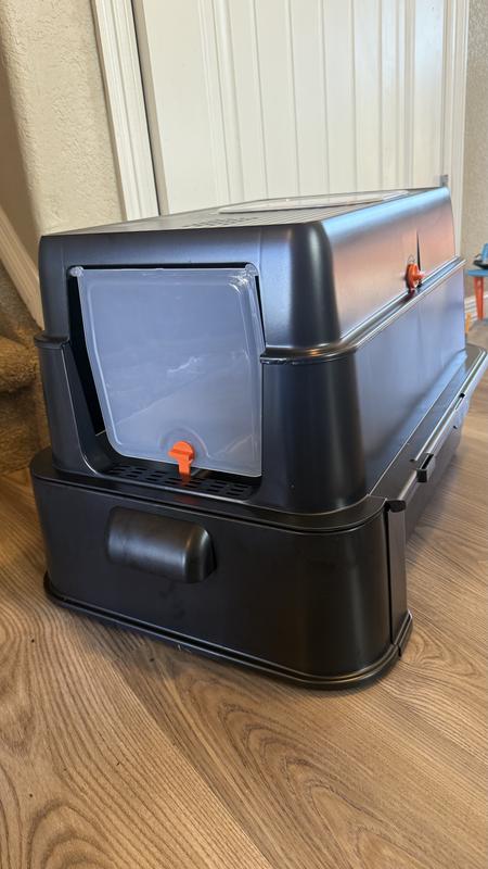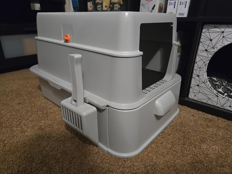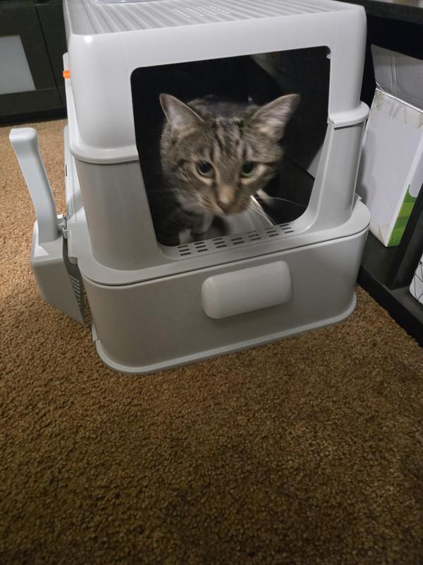I really like this cat box. We have all types of boxes and this box is nice because it combines the top entrance box with a front entrance box. I have cats that prefer the 2 different boxes, so this allows both preference types to use this box. No issues with getting cats to go in, but i did remove the front door to avoid any avoidance at first. I love that the bottom slides out and that the scooper hangs on the side of the box.