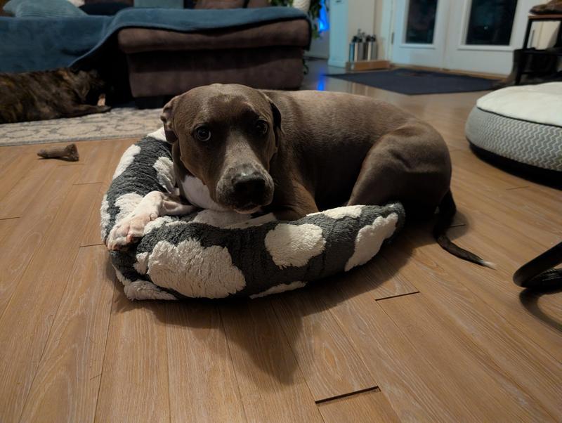 I’ve been looking for a quality dog bed for a while now and here it is! The cover is soft and plush plus TOTALLY removable for washing. The foam cushioning is thick, firm, holds its shape and very supportive. Dixie loves it, at least when she can get my 2 yo daughter out of it and have a turn for her self.