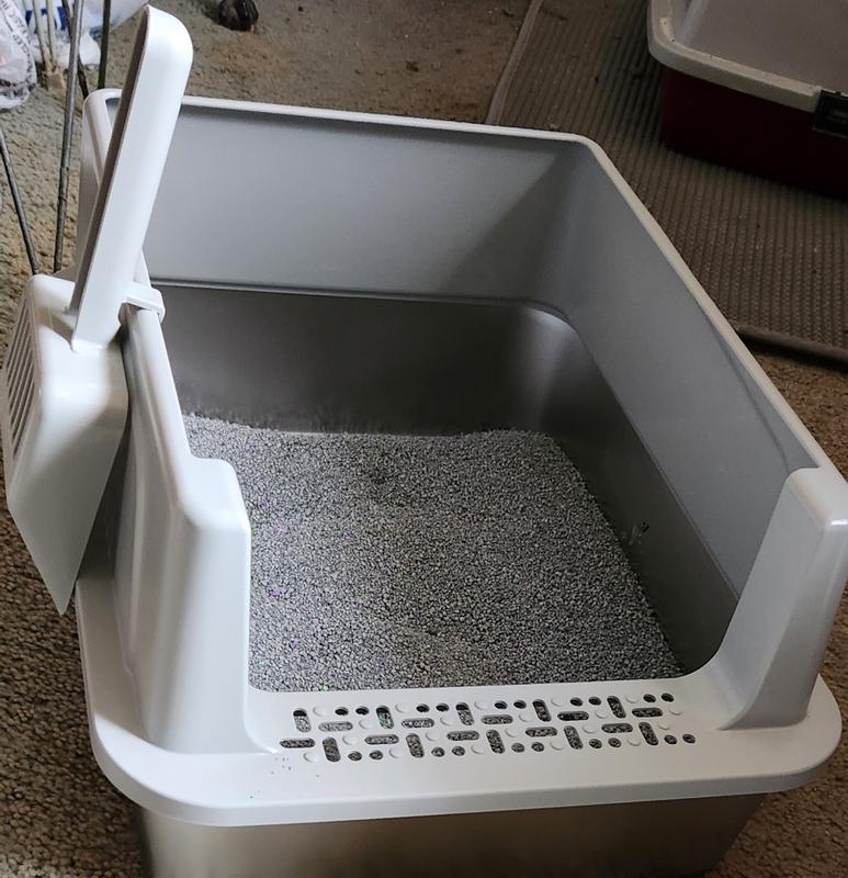 I received this litter box to review. The concept is great, stainless steel bottom to make it easy to scoop the litter, no sticking and does not retain the odor. The box comes with higher sides, which is nice, but do wish it was higher for the cats that like to "high pee". It's also nice that the scoop that it comes with can be hung on its side. This box is good for KITTENS. It is very much on the smaller side, so not a box that the kittens can grow with. It did not work for my adult cats as it is too short.