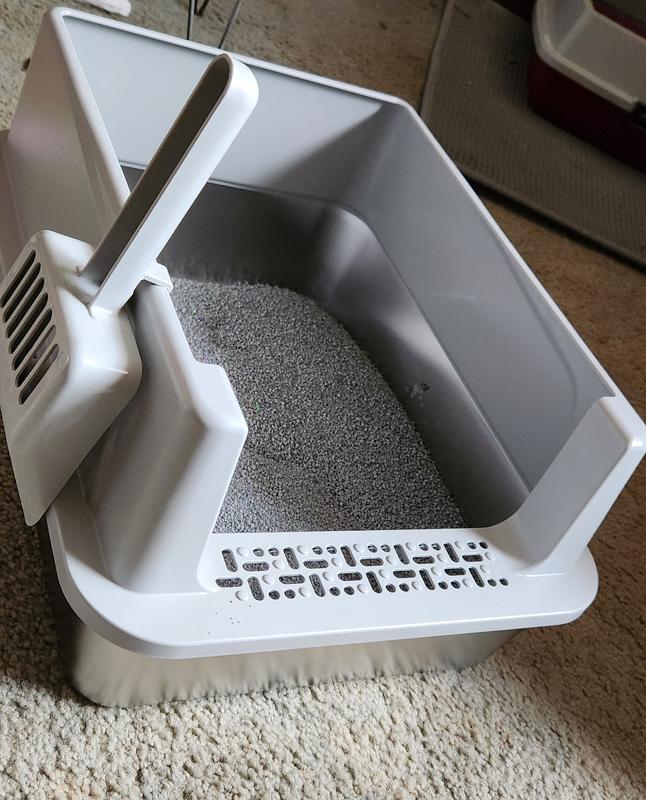 This is a wonderful litter box. The stainless steel bottom is easy to clean (no lingering odor) and the top is hard plastic for easy wiping. It comes with its own scoop that conveniently hangs on the side. It also has a step in with small holes in a cute design that allows excess litter to fall off paws and back in the box. My cat is big, 15 lbs, so it seemed a little small for him- but he is using it fine!