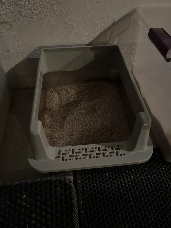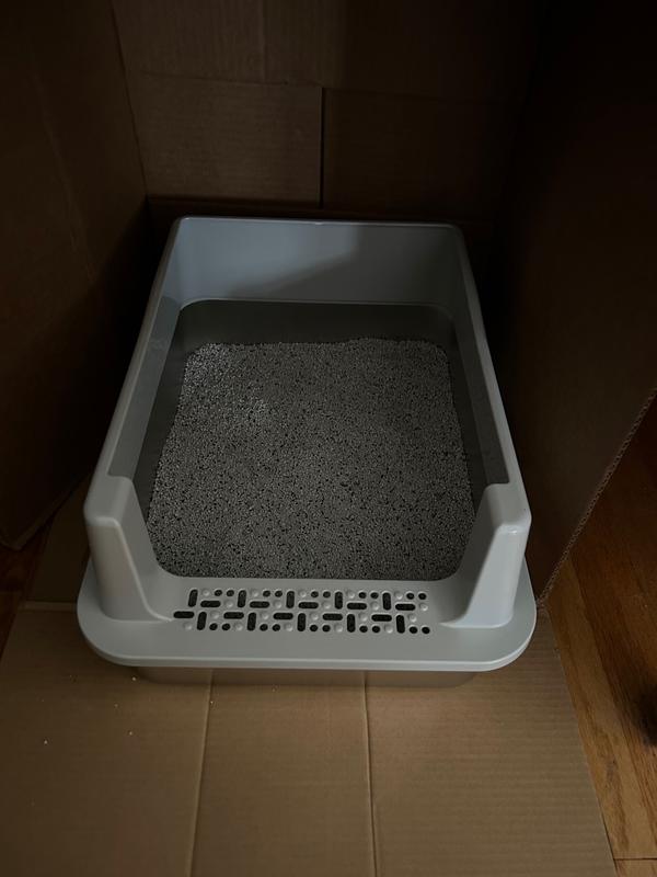 Super excited to receive this item. Love the guard on top that snaps on securely and little ledge at the entrance. I think this will help with stray litter...it will be so much easer to do a complete empty and cleaning. It would be good if it was a little deeper. (I have a high pee-er). Will update when it is tried out by the furry ones. This is as exciting as the 1st time we used clumping litter!