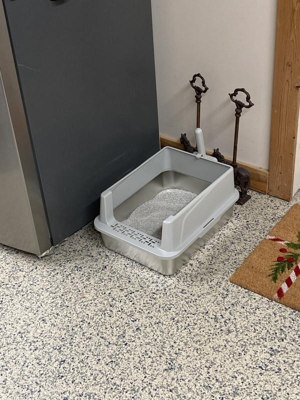 I like that it is stainless steel so that it won’t retain a smell. It seems a bit small for my bigger cat but he used it anyway! We have a litter robot at home but plan to use it for instances when I need to bring the kitties away from home for any reason.