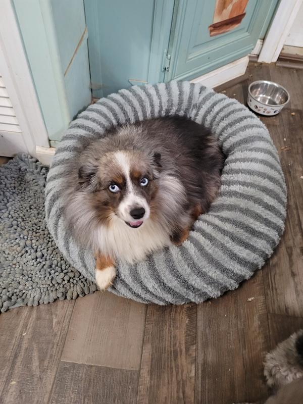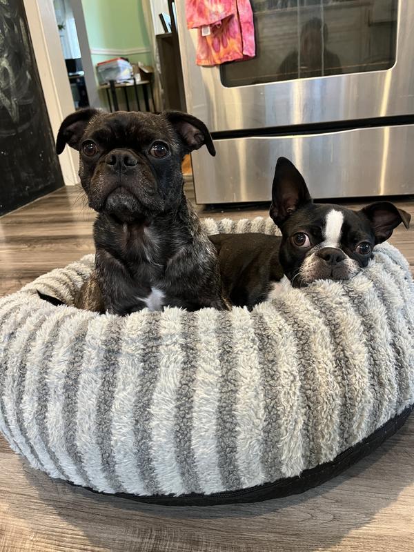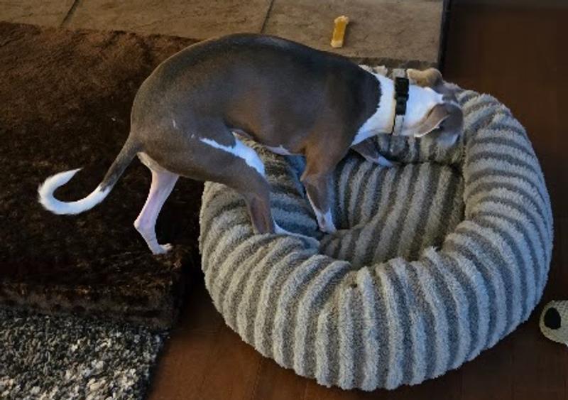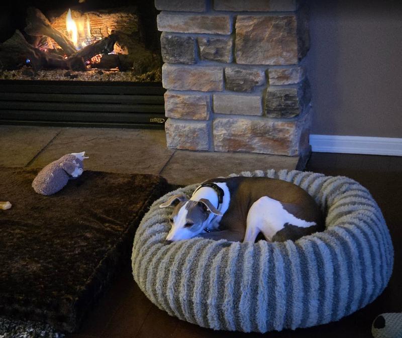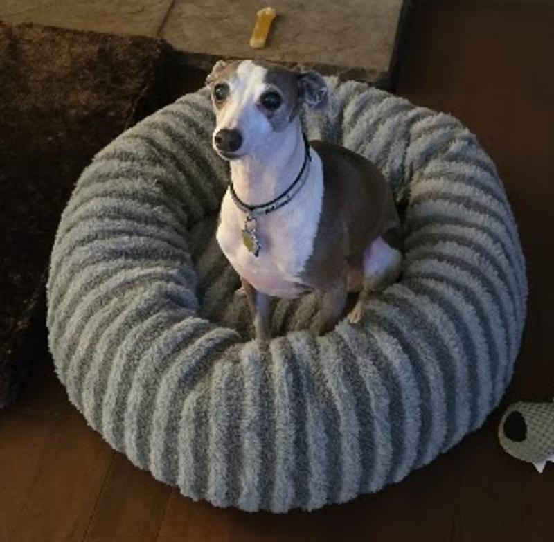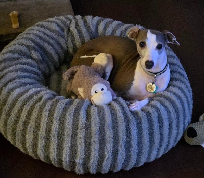 We just got the new dog bed for our girls, and our older girl instantly took over ownership of it. It literally took two seconds for her to crawl in and it’s been her favorite spot since. The donut design allows her to cuddle any direction she likes and the soft fabric keeps her cozy warm. The non-slip bottom is working great as it is still in the same spot after several days of use. The 23x23x8 is a great size for our Italian greyhound (16lb) and her favorite toy. We haven’t washed the cover yet, but it feels soft and thick, I think it’ll hold up well for a long time. The bottom is plush enough, so that its soft even on hardwood floors, according to our girl. I’d definitively recommend this bed, especially for colder days, to keep your furry friend cozy and warm.