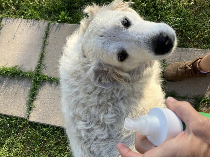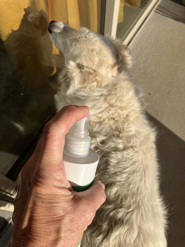 I was excited to see this product as a lot of essitial oils that I use for myself are toxic to dogs. I sat out on the patio to test this. I sprayed him down and