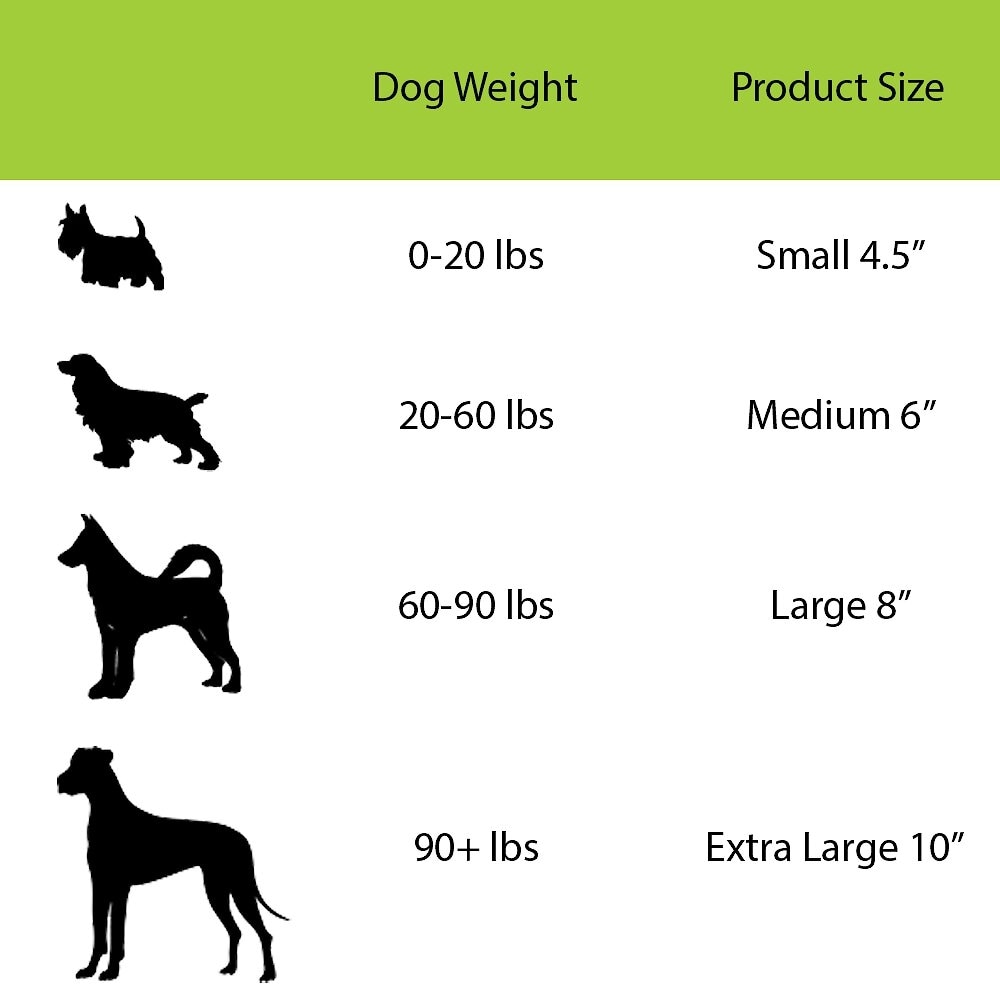 The following weight for each sized dog toy is: the 4.5 inch weighs 6.4 ounces, the 6 inch weighs 13.6 ounces, the 8 inch weighs 1.6 pounds, and the 10 inch weights 2 pounds.