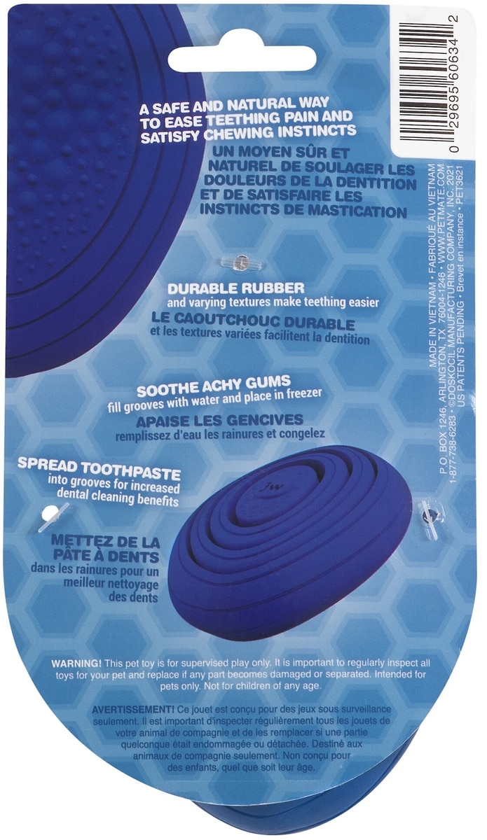 Love JW Pet products and this one doesn't disappoint. Very satisfying for puppy to chew and love the fact that I can freeze it with water in the grooves to help