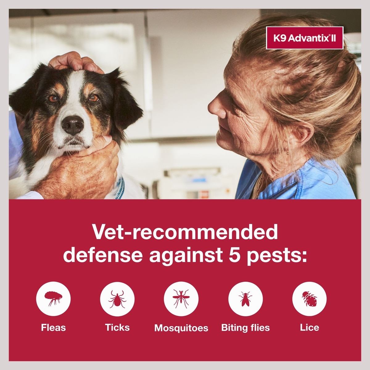 K9 Advantix II protects against fleas, ticks, mosquitoes, biting flies, and lice. It kills fleas on dogs within 12 hours and continues to prevent infestations for 4 weeks. Do not use on cats.