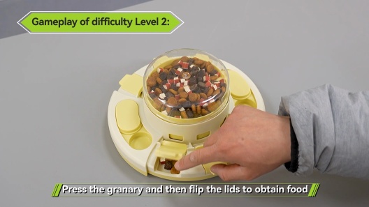 - This toy features 2 difficulty levels—level 1 with 8 treat compartments and level 2 with a press-top and flip lids.