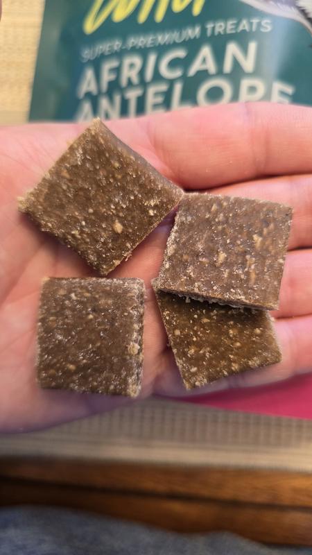Ours dogs went wild for these rosemary Antelope treats. They are a chewy but firm texture. They are pressed or rolled into thin squares, about 1 x 1 inch. Nice rosemary and mint aroma. I imagine they will always get my dogs attention as a high value treat.