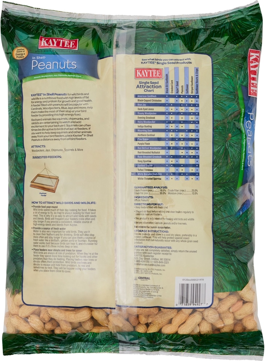 Kaytee In Shell Peanuts provide a natural foraging experience for birds and small critters since they crack open the shells themselves. Or choose 100% edible Kaytee Shelled Peanuts, for no messy leftovers and more attraction.