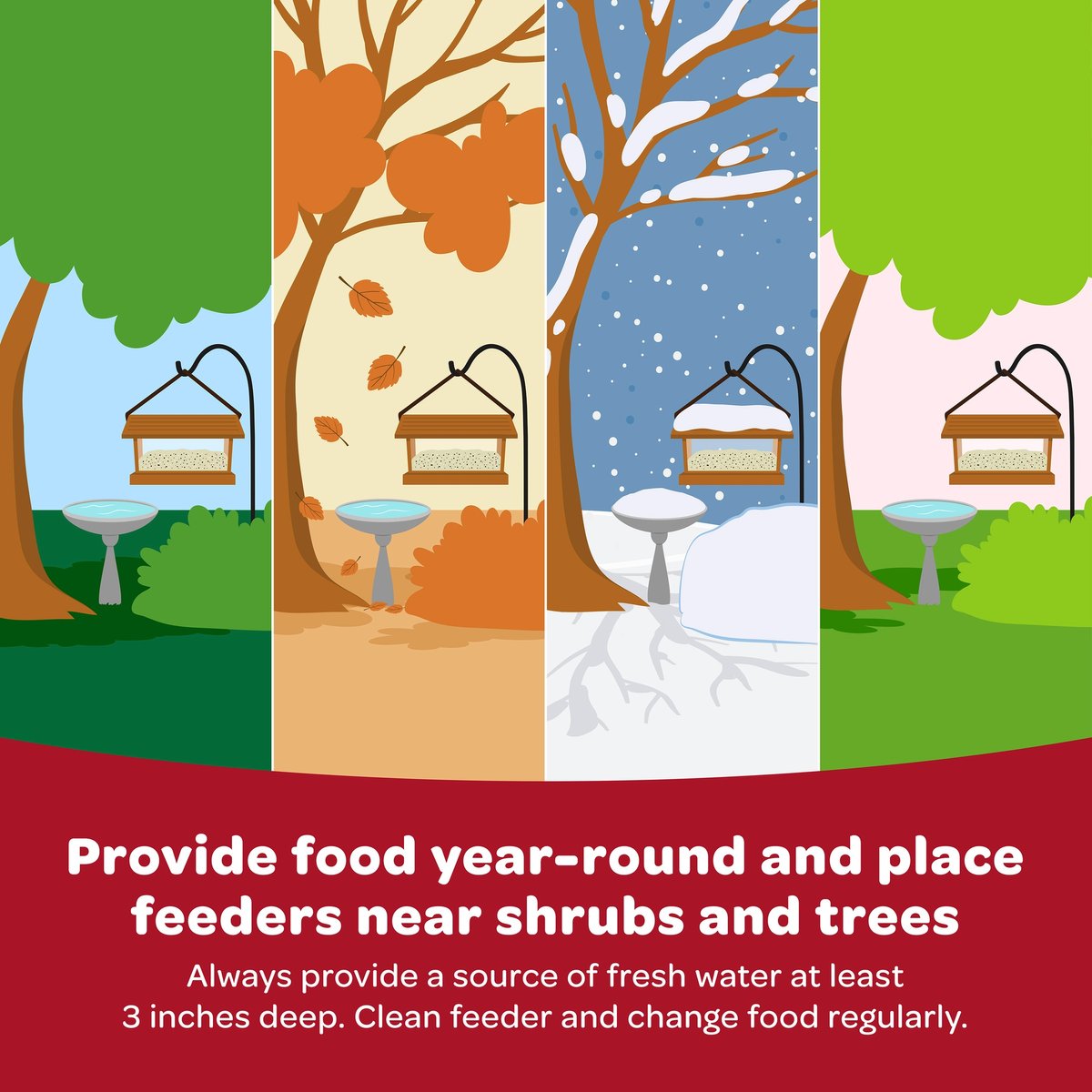 In addition to providing food year-round, always provide a fresh source of water. Wild birds use water for drinking and to clean their feathers, so they may visit more often and stay longer. Running water works best, so birds can hear it.