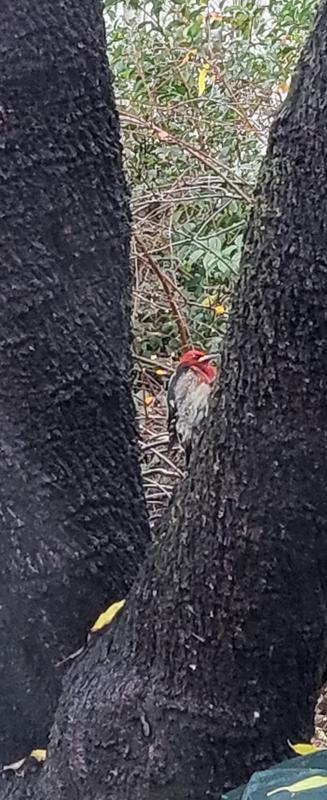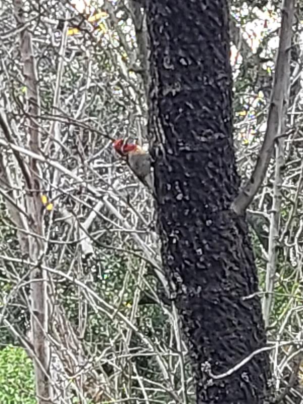 We have been enjoying our resident woodpecker, lovingly referred to as "Woody" or "Peck-Peck" for the last 6 years. He likes to hang out in the almond tree outside