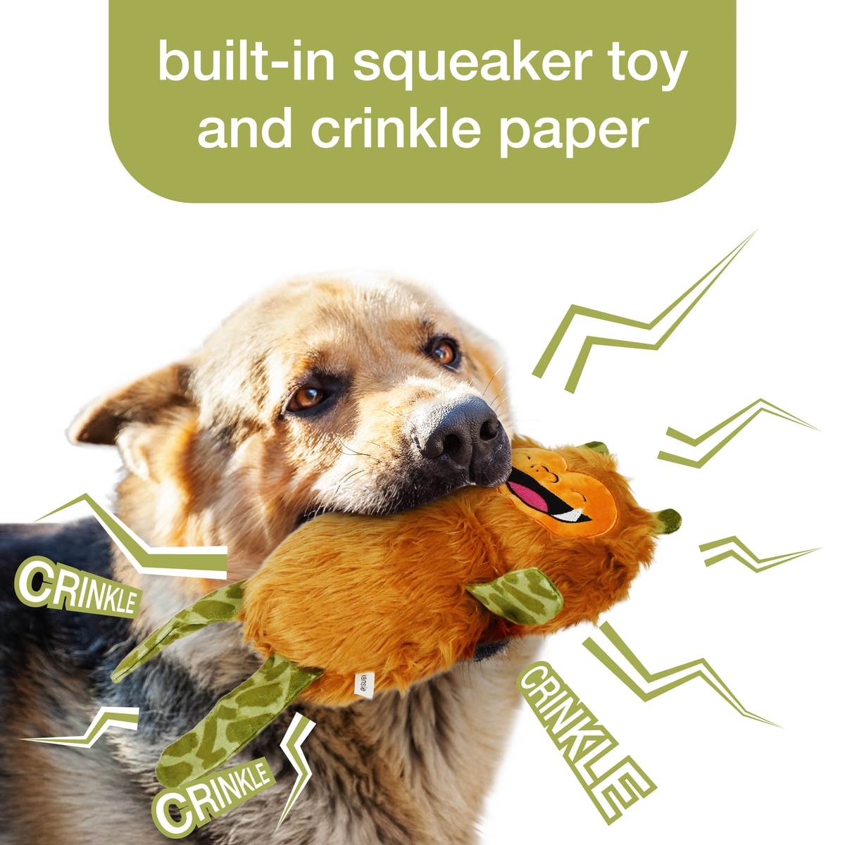 • Crinkle material provides an irresistible sound and texture while chewing or shaking.
