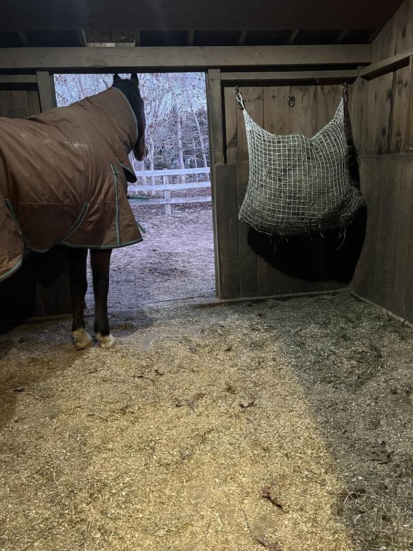 To use, simply hook the carabiner to your horses feeding location, and fill with the preferred hay.